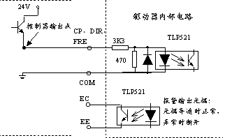 ○驅動器輸入信號包括控制脈沖 CP 、方向 DIR、脫機FRE(E),輸出信號ERR(OR)。驅動器內部接口電路及推薦接口電路,如圖2所示,其信號時序如圖3所示。