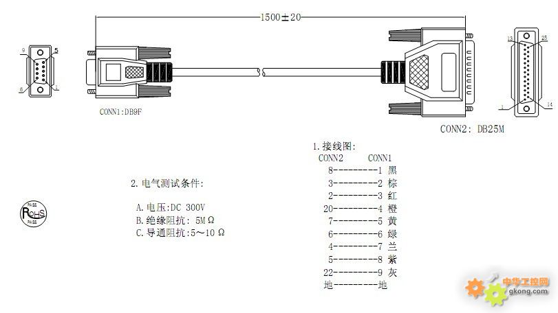 普通的DB9孔式到DB25針式線,總長(zhǎng)度為:100CM