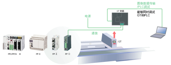 通過USB電纜及以太網連接計算機和GT,可實現同時操作GT數據傳輸和PLC調試。