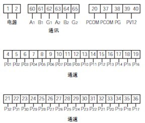 無源干接點:Pi(i=1-32)與公共端PV12為各通道接入端,同時PCOM和PG短接。