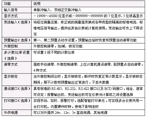 * 最高計數頻率10kHz, 0.0001~45.000的寬范圍計數比率 *5位或7位數字顯示方式 * 可以輸入雙相正交脈沖,自動識別正、反向運動 * 2點預置輸出。2種輸出方式,延時恢復及自動清零功能 * 外部控制清零,加/減計數,顯示鎖定功能 * 可提供雙計數方式,實現總量和分量功能 * 全透明、高速、高效的網絡化通訊接口,實現計算機與儀表間完全的數據傳送和控制。獨有的控制權轉移功能使計算機可以直接控制儀表的報警輸出和變送輸出。讀取一次測量數據的時間小于10ms。提供測試軟件,組態軟件和應用軟件技術支持 * 具備帶硬件時鐘的打印接口和打印單元,實現手動、定時打印功能,如果選配智能打印單元,可實現多臺儀表共用一臺打印機。 * 變送輸出可將測量 、變換后的顯示值以標準電流、電壓形式輸出供其它設備使用 * KSN系列儀表采用單片機嵌入式組合設計,硬件擴充性強,軟件平臺靈活,可以擴展開關量輸入、定時、程序順序控制等,不局限于標準功能。可按實際需要組合,以實現最佳性能。有些常用非標準功能。