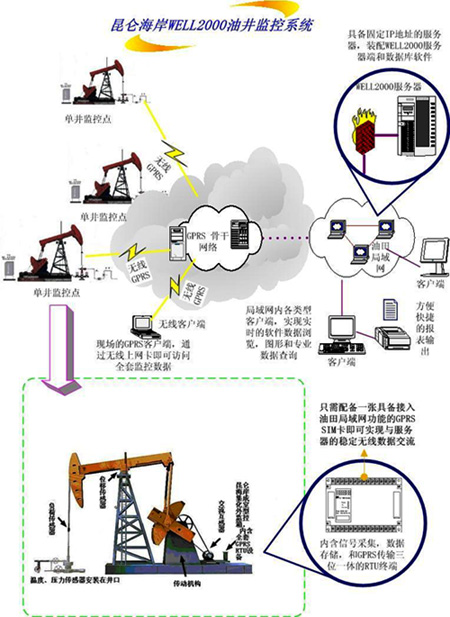 5.科學(xué)的的計算和統(tǒng)計 WELL2000系統(tǒng)軟件通過油井專業(yè)分析公式計算出各類型專業(yè)數(shù)據(jù),在界面上提供專業(yè)數(shù)據(jù)報表。例:根據(jù)軟件提供的光桿功率,地面效率,可以為使用者調(diào)整電機(jī)的工作容量和參數(shù)提供可靠的依據(jù)。其他的電流平衡度,功率平衡度,功率因素,日耗電等等重要專業(yè)數(shù)據(jù)也是油井工況分析的重要指標(biāo)。 WELL2000系統(tǒng)組成 WELL2000采用多個采集點對服務(wù)器的模式,一個采油井配備一套WELL2000硬件設(shè)備,向RTU設(shè)備設(shè)置好目的IP地址,各監(jiān)控點即可獨立的與服務(wù)器端口進(jìn)行數(shù)據(jù)交流。