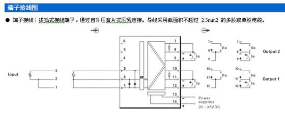 ● 接線端子 拔插式接線端子 端子標號: 輸入接線端 1、2、3、4、5、6 輸出接線端 7、8、9、10、11、12 供電電源接線端 13-、14+ 適合截面積不超過 2.5mm2 的多股或單股電纜。● 安裝方式 35mm 標準導軌卡式安裝;建議采用垂直 安裝形式(見垂直安裝圖示)。● 環境溫度濕度限制 工作運行溫度 0~+60℃ 運輸儲藏溫度 -20~80℃ 相對濕度 5~95%RH● 外形尺寸 寬(厚)×高×深=W16×H116×D110(mm) (見外形尺寸圖)● 整機重量 約110g~120g● 性能指標標準精度: ±0.1%FS溫度漂移: ±0.015%/℃響應時間: ≤1s(0 → 90%)穩定時間: ≤3s電源電壓變動影響: ±0.1%(允許電壓范圍)負載電阻變化影響: ±0.1%/250Ω通道隔離: 輸入-輸出-電源之間隔離絕緣電阻: ≥100MΩ/500V DC(AC)隔離能力: 1500VAC/1 分鐘 50Hz負載能力: ≤500Ω (電流輸出4~20mA、0~20mA)≥3KΩ (電壓輸出0~5V、0~10V)抗電磁兼容性: 符合 IEC 61000 相關抗電磁標準產品結構● 結構 卡裝式構造;模塊化表芯;ABS 材質機殼;拔插式端子。1. 輸入接線端 綠色標識,連接至現場設備2. 電源指示燈: 儀表通電或處于正常工作狀態時燈亮3. 輸出接線端 綠色標識,連接至控制系統或其它單元組合儀表4. 左側機殼蓋 與儀表右面機殼緊密扣合,用合適工具可撬開5. 電源接線端 2孔 3mm 供電電源接線 (13-/14+)6. 透氣散熱孔 密集散熱孔,通風對流設計7. 產品標簽粘貼部位 PET耐熱材質標簽,標注產品型號代碼 及相關重要參數8. 右側機殼 為主體機殼構件,與左機殼蓋扣合。9. 安裝卡口 35mm 標準 DIN 導軌卡式安裝