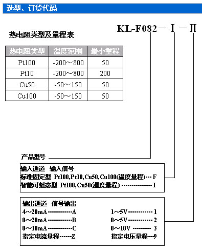訂貨須知:1、參照選型舉例,正確規范書寫訂貨型號代碼。舉例1 輸入:Pt100 0~100℃ / 輸出: 4~20mA 訂貨代碼為:KL-F082-FA(Pt100 0~100℃)舉例2(智能可組態) 輸入:Pt100 0~150℃ / 輸出: 4~20mA 訂貨代碼為:KL-F082-IA(Pt100 0~150℃)