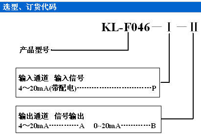 訂貨須知:1、參照選型舉例,正確規范書寫訂貨型號代碼。● 舉例1 輸入:變送器 4~20mA ● 輸出:4~20mA● 訂貨代碼為:KL-F046-PA 舉例2 輸入:變送器 4~20mA ● 輸出:0~20mA 訂貨代碼為:KL-F046-PB