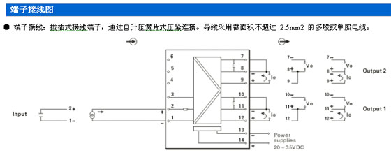 ● 接線端子 拔插式接線端子 端子標號: 輸入接線端 1、2、3、4、5、6 輸出接線端 7、8、9、10、11、12 供電電源接線端 13-、14+ 適合截面積不超過 2.5mm2 的多股或單股電纜。