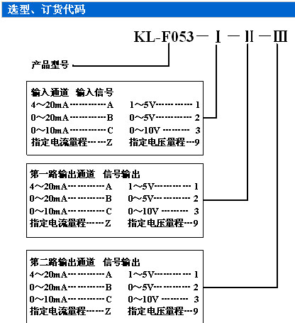 訂貨須知: 1、參照選型舉例,正確規范書寫訂貨型號代碼。 2、在第一輸出通道、第二輸出通道中選擇電流或電壓輸出時, 因負載電阻的關系,請將電流輸出設定為第一路通道輸出 ● 舉例1 輸入: 4~20mA ● 輸出:1路4~20mA;2路4~20mA ● 訂貨代碼為:KL-F053-AAA 舉例2 輸入: 4~20mA ● 輸出: 1路4~20mA;2路 1~5V; 訂貨代碼為:KL-F053-AA1