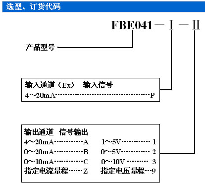 訂貨須知: 1、參照選型舉例,正確規范書寫訂貨型號代碼。 舉例1: 輸入:變送器4~20mA 輸出:4~20mA 訂貨代碼為:FBE041-PA 舉例2: 輸入:變送器4~20mA 輸出:0~5V 訂貨代碼為:FBE041-P2