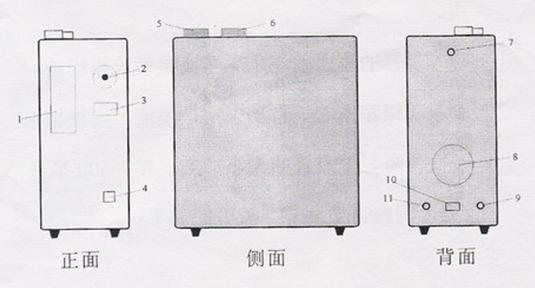 1、顯示窗; 7、排氣口 2、壓力指示; 8、排風(fēng)機(jī) 3、流量指示; 9、氫氣出口 4、電源開并沒有(指示燈) 10、電源插座 5、干燥管蓋; 11、保險管座 6、電解池加液口 |