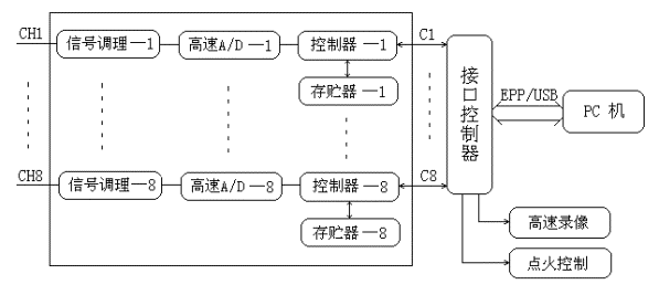 功能說明: 信號調理單元共有8個, 分別對各傳感器的輸入信號進行預處理; 高速A/D單元共有8個,將模擬量以20MHz采樣頻率轉換為數字量; 控制器單元負責A/D控制、數據存貯、讀取、接口控制; 接口控制器協調各路采集單元同步工作,與主控計算機進行數據交換。 該系統為高速多通道同步數據采集系統, 在系統設計時采用多通道同步技術方案,以保證對瓦斯快速爆炸過程中溫度、 壓力及火焰的同步真實記錄再現。多通道同步采集的實現是由高速可編程器件的復雜邏輯組合完成的, 每個通道獨立采樣是這一技術的基本保證,如果多路信號共用一個采集單元,那么要保證同步記錄是幾乎不可能的。 對各個通道協調控制是該系統的一個特點,實現這一功能,就必須采用高速可編程邏輯單元。 該系統的獨立協調控制避免了各信號道之間的相互干擾;系統觸發方式可以選擇外部、內部、信號等方式; 系統軟硬件的協調控制通過計算機的USB口進行數據傳輸及控制,整個系統12VDC供電, 全部安裝在一個機箱內。 |