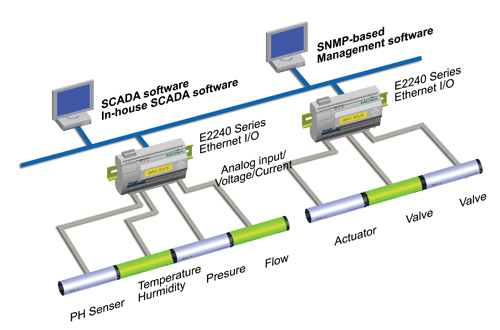 將數字輸入、輸出信號整合到TCP/IP網絡 網絡 ioLogik™ E2240是為系統集成商通過TCP/IP網絡實現對遠程開/關設備的數據采集和控制而設計的,如接近開關、機械開關、按鈕、光傳感器、LEDs以及光電開關。該設備支持多種以太網協議,例如Modbus/TCP,SNMP,HTTP,TCP,UDP,傳輸速率可達100Mbps,從而實現高速數據采集。數據可被多達10臺主機共享。相比傳統的現場總線和串行通信而言,基于以太網的I/O服務器在當今IT架構的系統中實現遠程控制和數據交換更為靈活。 |
