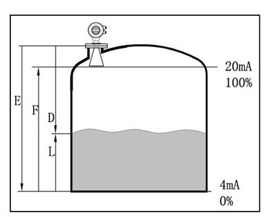 - 若介質為低介電常數(shù)當其處于低液位時,罐低可見,此時為保證測量精度,建議將零點定在低高度為C 的位置。