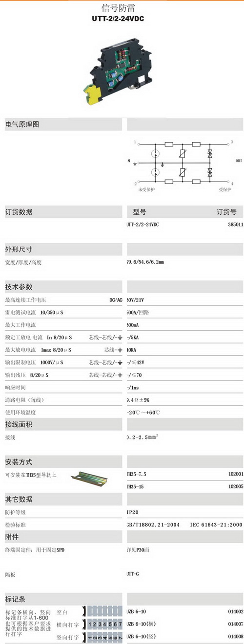 UTT-2/2-24VDC 信號防雷電涌保護器