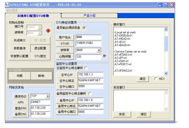 DTU的配置可以在串口工具下采用AT指令完成配制,也可以通過我們提供的圖形配置軟件完成配置,如果DTU與監控中心聯網,也可以通過GPRS遠程配置。