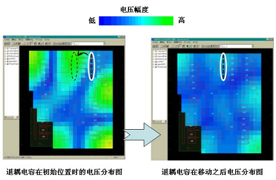 如果電源層與地層之間發(fā)生振蕩時,將會增加不必要的電磁輻射。地電層振蕩分析功能會建立一個基于地電參考層形狀和地電層之間電容分布的仿真模型,用來仿真和分析地電層的振蕩。它將PCB 的參考層振蕩顯示為一個階梯等級圖。(電壓幅值較大的區(qū)域顯示紅色調(diào),電壓幅值較小的區(qū)域顯示為藍色調(diào)。)您可以在電壓幅值較大的區(qū)域放置退耦電容以抑制地電層的振蕩,或者您也可以通過調(diào)整退耦電容的位置、數(shù)量和值來進行改變。