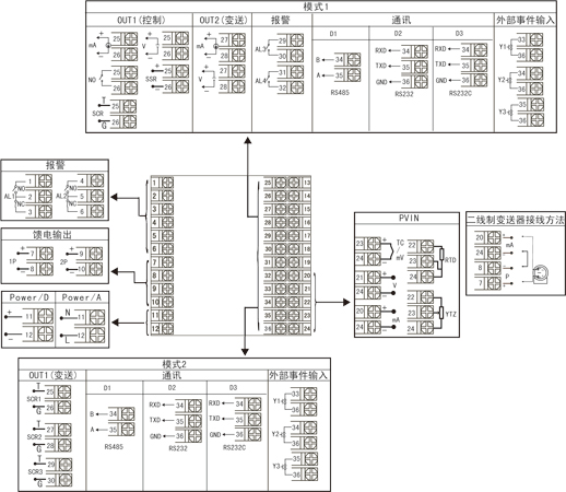 無(wú)輸出 RS-485通迅接口(Modbus) RS232通迅接口(Modbus) RS232C打印接口 外部事件輸入(強(qiáng)制手動(dòng)) 外部事件輸入 外部事件輸入 |