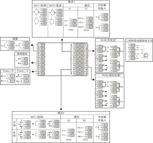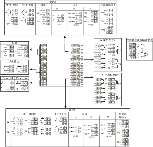 ★ 注:上述接線圖中在同一組端子標(biāo)有不同功能的,只能選擇其中一種功能。如RS485和RS232在同一組接線端子上,只能選擇一種。