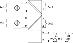 型號舉例:NHR-M35-K1/K1-D 三端子智能開關量轉換器,雙路輸入/輸出都為繼電器接點信號,供電電源為DC24V。 |
