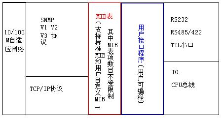 - 支持SNMPV1,SNMPV2C,SNMPV3協(xié)議,支持標(biāo)準(zhǔn)MIB表和用戶自定義MIB表,接口程序用戶可自己編程。