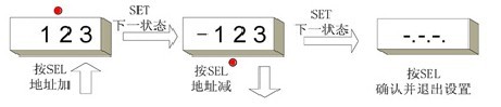 ②將SET與GND短接后,將進入參數設置狀態:循環顯示站加地址狀態(360度模擬點亮)、減地址狀態(180度模擬點亮)、-.-.-.。其中-.-.-.為退出提示。需要修改對應參數時,在顯示該參數后瞬間短接GND和SEL,可以循環改變對應值,流程示意見下圖: