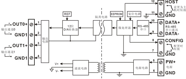 1、模擬信號輸出 12位輸出精度,產品出廠前所有信號輸出范圍已全部校準。在使用時,用戶也可以很方便的自行編程校準。具體電流或電壓輸出量程請看產品選型,輸出兩路信號時兩路輸出選型必須相同。