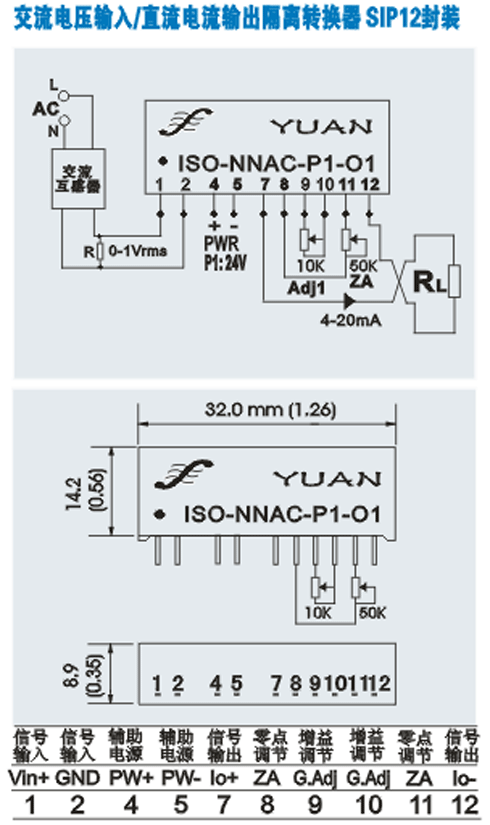 說明: SunYuan ISO系列交流轉直流(AC/DC)信號變送器 IC,是一種將交流信號采集轉換成線性對應直流信號的混合集成電路。該電路在同一芯片上集成了一組多路高隔離的DC/DC電源和一組AC/DC信號轉換電路。可以將傳感器采集到的0-1Vrms(50~60HZ)交流信號按比例轉換成4-20mA/0-10mA /0-20mA直流電流信號或0-1V/0-2.5V/0-5V/0-10V直流電壓信號。外接互感器后就可以組成單相或多相隔離變送器實現輸入與輸出信號之間的隔離。產品在電力遠程監控、儀器儀表、醫療設備、工業自控等領域廣泛應用。