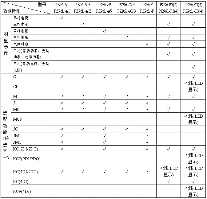 2、PZ96(L)-E3(4)在選配KC(4DI)功能時具備1路有功電能脈沖信號輸出端口,在選配KC(2DI/2DO、4DI/2DO)功能時無脈沖信號輸出端口;