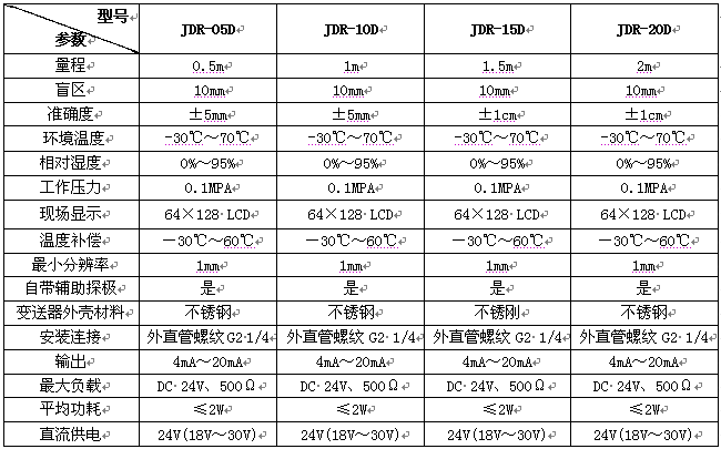 安裝方便,可帶料安裝且不需要輔助探極; 被測介質(zhì)自動校正,更換被測介質(zhì),產(chǎn)品不需要重新標定; 環(huán)境溫度自動補償,環(huán)境溫度變化,產(chǎn)品不需要重新標定; 智能信號處理技術(shù),可適應(yīng)多種工作環(huán)境; 電流輸出零點滿度調(diào)整功能; 遷移量設(shè)置功能; 高亮、高清晰、低功耗液晶漢字顯示; 按鍵設(shè)置,人機界面友好,易于操作; 過壓及防雷保護設(shè)計,提高了設(shè)備的抗干擾能力; 傳感器內(nèi)管采用PTFE管,外管采用鋼構(gòu)件制造而成,經(jīng)久耐用。 直管螺紋結(jié)構(gòu),安裝連接方便。 4~20mA信號輸出。 防爆標志:_EXibⅡCT6