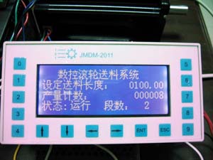 該控制系統帶文本顯示,使用時通過按鍵直接操作;開機界面可設置機械制造商公司名及聯系方式,為貴公司免費打廣告,讓生意旺起來!運行界面顯示“設定送料長度,產量計數,狀態,段數”其中“設定送料長度”指送料系統正在送料的長度,“產量計數”指送料完成的產品數量,狀態指系統正在運行的狀態,有“運行”“停止”“手動”三種,段數指系統正在運行的送料段數。實為集巧妙、大方、人性于一體的控制系統。