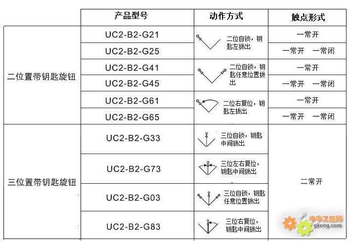產(chǎn)品系列 結(jié)構(gòu)形式 動作方式 觸點(diǎn)數(shù) UC2-B2 -G ■ ■ UC2-B2系列金屬按鈕 鑰匙旋鈕 0:3位自鎖,鑰匙任意位置拔出 1:3位左自復(fù),鑰匙右拔出 2:2位自鎖,鑰匙左拔出 3:3位自鎖,鑰匙中間拔出 4:2位自鎖,鑰匙任意位置拔出 5:3位自鎖,鑰匙左右拔出 6:2位右自復(fù),鑰匙左拔出 7:3位左右自復(fù),鑰匙中間拔出 8:3位右自復(fù),鑰匙中間拔出 9:3位自鎖,鑰匙左拔出 A:3位自鎖,鑰匙右拔出 B:3位左自復(fù),鑰匙中間拔出 1:一常開 2:一常閉 3:二常開 4:二常閉 5:一常開一常閉 6:二常開+二常閉 7:二常開+一常開 8:二常閉+一常開 9:二常閉+一常閉 0:二常閉+一常閉 E:四常開 F:四常閉