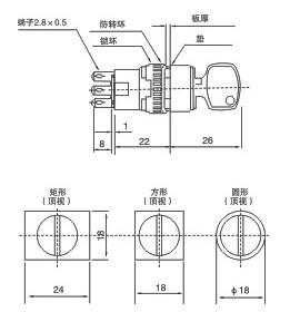 3.三位置鑰匙鈕鑰匙取出位置有兩種類型:(1).鑰匙在中間位置可拔出;(2).鑰匙在三個位置均可拔出。