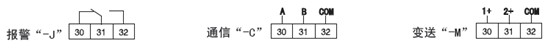 注1:儀表端子30、31、32為輔助功能輸出端:故障報警“-J”、通信“-C”、變送“-M”。