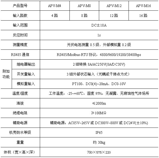 在光伏發電系統中,數量龐大的光伏電池組件進行串并組合達到需要的電壓電流值,以使發電效率達到最佳。APV-M系列智能光伏匯流箱主要作用就是對光伏電池陣列的輸入進行一級匯流,用于減少光電池陣列接入到逆變器的連線,優化系統結構,提高可靠性和可維護性。在提供匯流防雷功能的同時,還監測了光電池板運行狀態,匯流后電流、電壓、功率,防雷器狀態、直流斷路器狀態采集,繼電器接點輸出等功能,并帶有風速、溫度、輻照儀等傳感器接口功能供客戶選擇,裝置標配有RS485接口,可以把測量和采集到的數據上傳到監控系統。