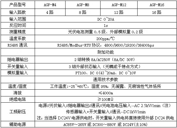 AGF系列光伏匯流采集裝置是專門應用于智能光伏匯流箱,用于監測光伏電池陣列中電池板運行狀態,光伏電池電流測量,匯流箱中防雷器狀態采集、直流斷路器狀態采集、繼電器接點輸出,帶有風速、溫度、輻照儀等傳感器接口,裝置帶有RS485接口可以把測量和采集到的數據和設備狀態上傳。