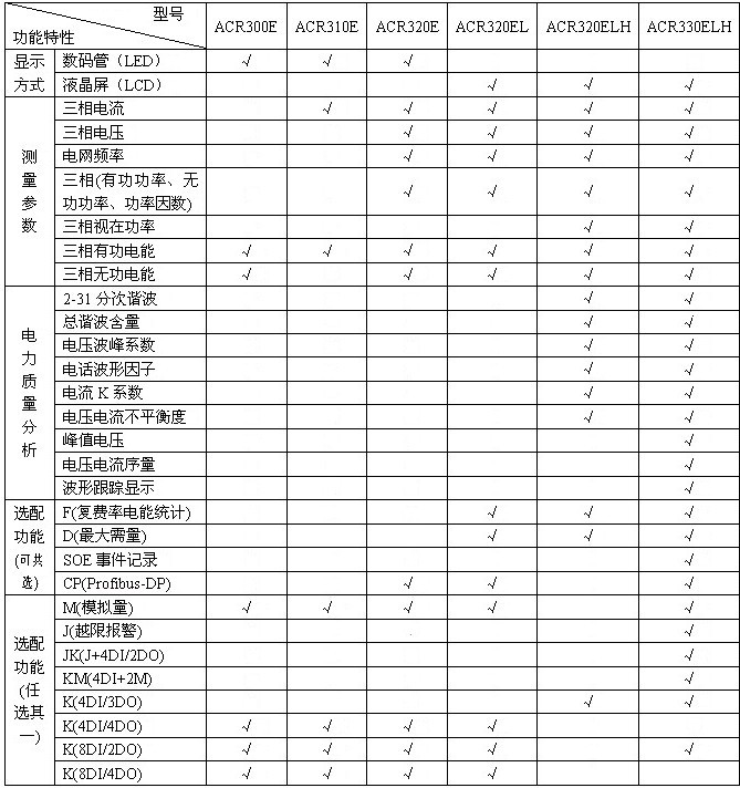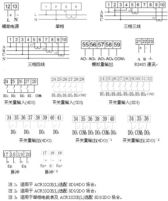 1、ACR300E、ACR310E、ACR320E(L)在選配K(4DI/4DO、8DI/4DO)功能時無脈沖信號輸出端口;