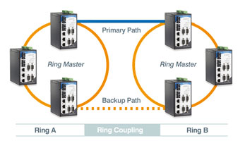 對于部分系統(tǒng)來說,將現(xiàn)有設(shè)備連接起來形成一個大冗余環(huán)是比較困難的,因為設(shè)備的分布比較分散。NPort®S8455IMM-SC支持Ring Coupling,可以讓分布在不同地點的設(shè)備形成若干個小冗余環(huán),并且這些小冗余環(huán)之間可以通過網(wǎng)絡(luò)相互連接。