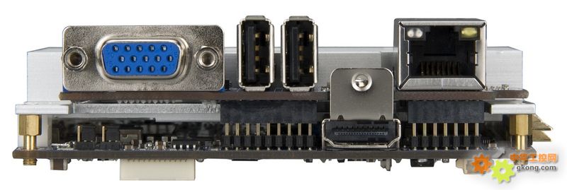該產品采用附加 I/O 子卡的特殊設計,在板載原生 HDMI 接口外,補充增加一個VGA接口,一個千兆以太網接口和兩個USB2.0接口。其它功能包括:以 S/PDIF 支持 6 聲道 DTS 音效,通過板載針腳提供對 4 個附加 USB2.0 接口,一個LPC連接器,SMBUS連接器,PS/2 接口,音頻接口,LVDS,4 對數字 IO 接口和兩個UART 接口。