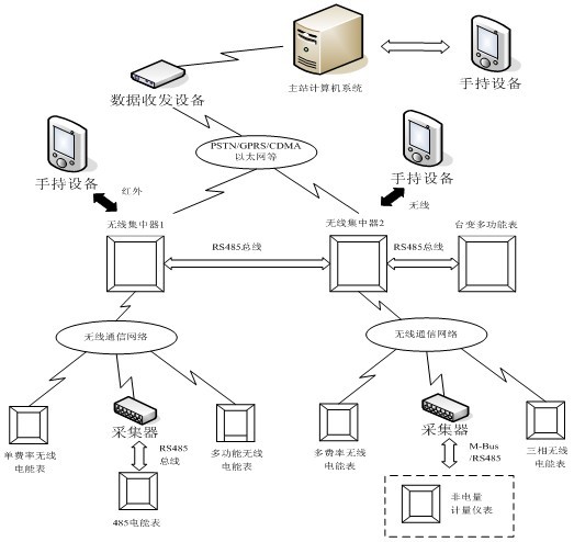 圖2為ZIGBEE(物聯(lián)網(wǎng))無(wú)線網(wǎng)絡(luò)電能管理系統(tǒng)網(wǎng)絡(luò)拓?fù)鋱D,整個(gè)網(wǎng)絡(luò)主要由四部分組成:計(jì)量?jī)x表、本地?zé)o線通信網(wǎng)絡(luò)、遠(yuǎn)方通信網(wǎng)絡(luò)以及數(shù)據(jù)交換設(shè)備。整個(gè)網(wǎng)絡(luò)由計(jì)量?jī)x表、ZIGBEE采集器(負(fù)責(zé)與儀表之間的通信)、ZIGBEE網(wǎng)絡(luò)終端(負(fù)責(zé)與上層通訊網(wǎng)絡(luò)的對(duì)接,譬如工業(yè)以太網(wǎng)等)、上層通信網(wǎng)絡(luò)和數(shù)據(jù)交換存儲(chǔ)設(shè)備。ZIGBEE無(wú)線通信管理系統(tǒng)一般采用的組網(wǎng)方式是MESH的網(wǎng)狀網(wǎng)絡(luò),MESH網(wǎng)絡(luò)能更好得保證通信質(zhì)量,保證單一節(jié)點(diǎn)出現(xiàn)故障時(shí)不影響其他節(jié)點(diǎn)通信狀態(tài)。