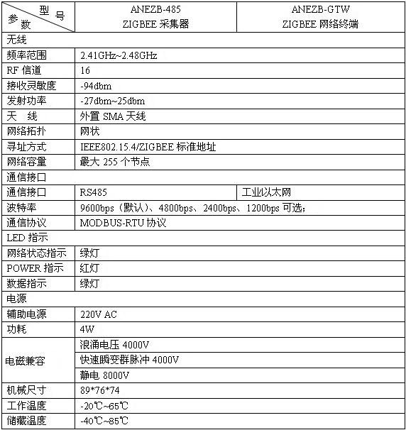 表2 ANEZB系列ZIGBEE通訊模塊性能參數(shù)表