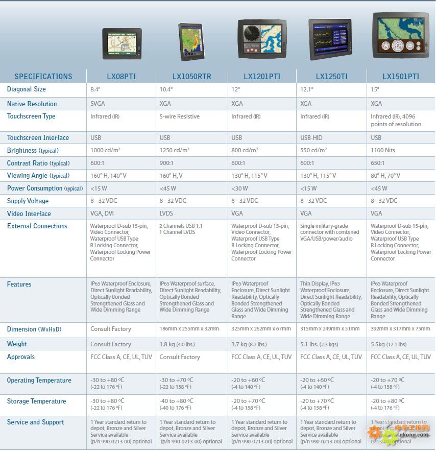 LX系列為軍事、礦業(yè)、重工、艦船及緊急救援應(yīng)用的理想的選擇。專為極端環(huán)境中高可靠及高性能表現(xiàn)而設(shè)計。極寬工作溫度,可靠的紅外及五線電阻觸摸,IP65表面防水設(shè)計,光學(xué)粘合技術(shù)將防護玻璃加固并同時增強對比度,以達到極佳的視覺效果。低功率LED背光,高EMI性能,并確保長顯示壽命。
