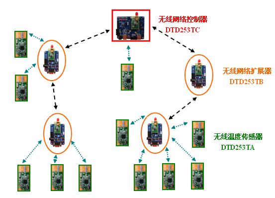 無線傳感器網絡是支撐物聯網的核心技術之一,而且被認為是工業自動化網絡及信號傳輸的一次重大革命。無線溫度傳感器網絡是由大量具有溫度測量功能的傳感器節點通過自組織的無線通信方式,相互傳遞信息,協同完成測溫功能的智能專用網絡。它綜合了傳感器技術、嵌入式計算技術、通信技術、分布式信息處理技術、微電子制造技術和軟件編程技術,可以實時監測、感知和采集網絡所監控區域內的各種環境溫度的信息,并對收集到的溫度信息進行處理后傳送給監控中心,構成完整的溫度監控系統。DTD253T是由西安達泰公司設計研發的采用Zigbee2007Pro標準的網絡化無線傳感器網絡系統。 DTD253T系統主要由無線網絡控制器DTD253TC、無線網絡擴展器DTD253TB、無線溫度傳感器DTD253A組成。