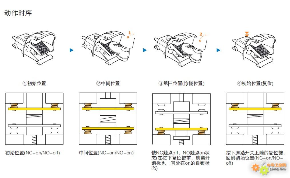 通過設(shè)置于踏板底端的阻力點(diǎn)提供第三位置,構(gòu)成動(dòng)作形式OFF-ON1-ON2,因此在初始位置設(shè)備停止?fàn)顟B(tài),在中間位置提供設(shè)備的啟動(dòng)就緒信號(hào),第三段位置提供設(shè)備的啟動(dòng)或停止信號(hào)。