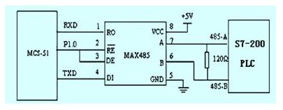 單片機選用MCS51,MCS-51的串行口與MAX485芯片相接,然后與S7-200 PLC的RS-485口進行通訊,如圖1所示: