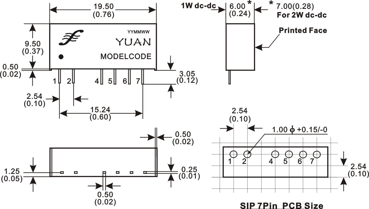 SIP 7Pin 2W封裝尺寸 19.6 x 7.00 x 10mm