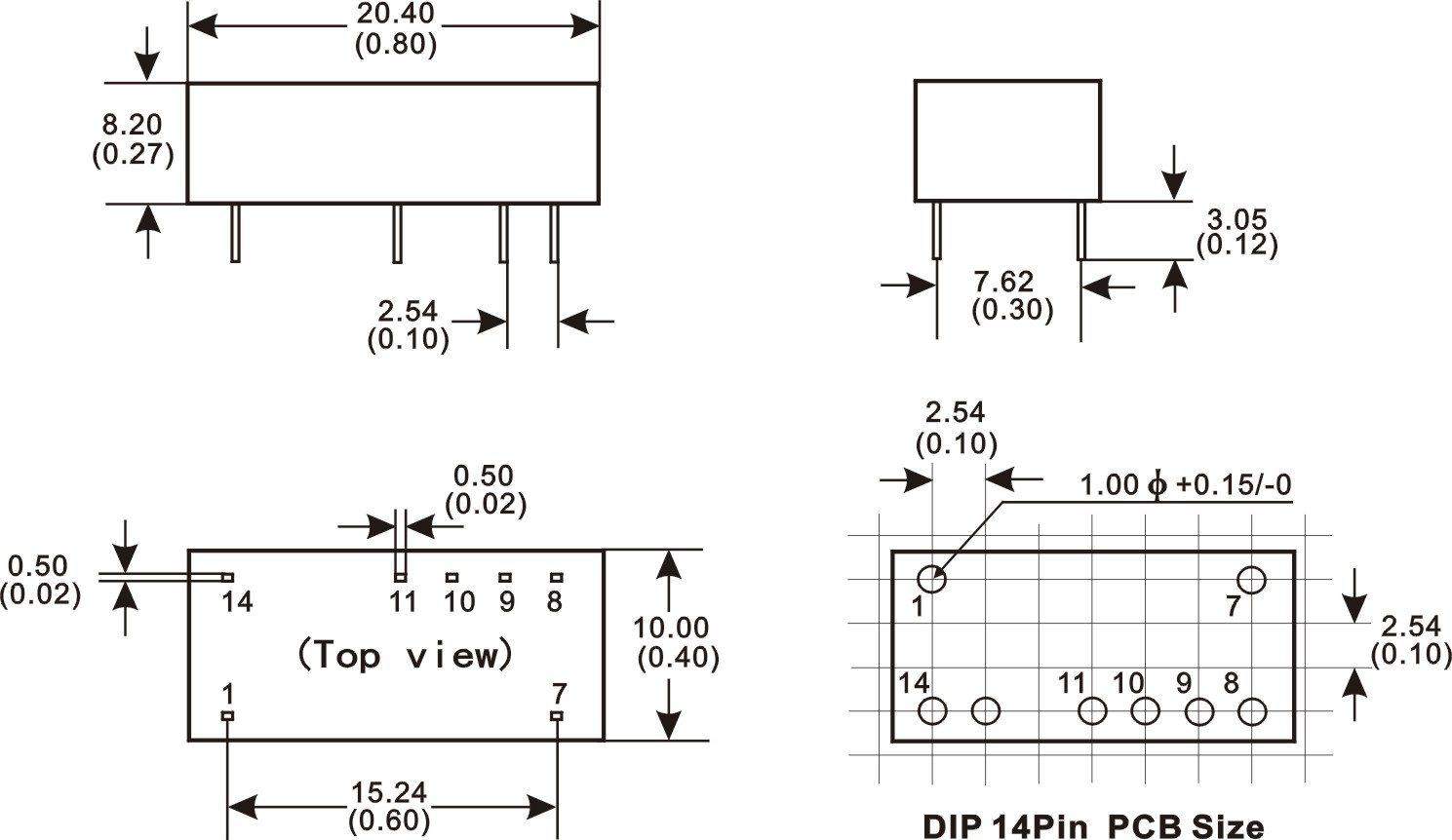 DIP 14Pin 1W/2W封裝尺寸 20.4 x 10x 8.2mm