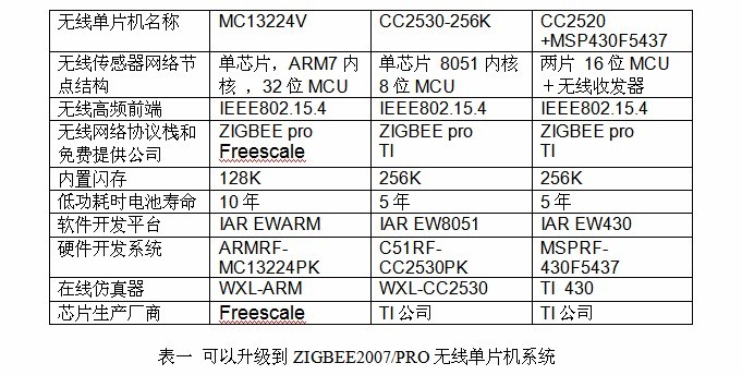 ZigBee 無線網絡的基本部件包括協調者( coordinator )路由器 (router) 和終端節點 ( end device) ,這些基本部件的核心都是一個完整的,具有 IEEE802.15.4 標準無線收發器和微處理器(單片機)的片上系統 SoC( 也稱為無線單片機 ) ,由于 ZigBee2007 和 ZigBeePro 軟件協議棧比較復雜,需要較大的內存空間和較大的運算處理能力,所以,需要無線單片機具有這樣的能力,才能升級到 ZigBee 2007/Pro 協議棧,表一是部分可以升級到 ZigBee2007/Pro 的無線單片機系統。
