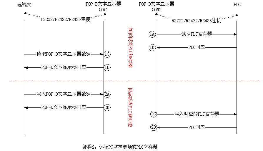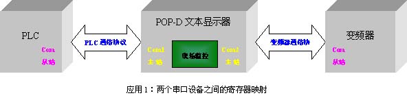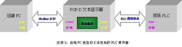 需要說明的一點是,在圖【應用2】中,連接至Com1的設備選擇為【Modbus RTU Master】,即遠端PC機作為主站,POP-D文本顯示器作為從站。這樣選擇的好處是:POP-D文本顯示器讀取PLC中的參數后存暫存在文本內部,只有當遠端PC機發起讀命令時才回應數據給PC;同樣地,POP-D文本顯示器只有在接收到遠端PC 發出的控制命令,才會把數據寫入到現場PLC中,從而也大大降低了PLC的通信負荷。