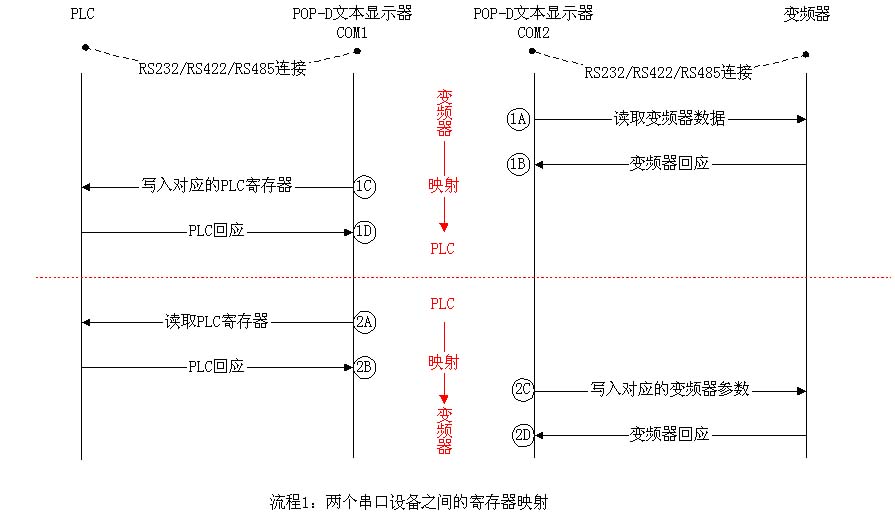 POP-D文本顯示器可以用其兩個串行端口連接變頻器和PLC,并分別進行設備的狀態監視和參數設定。在一些工業應用場合,變頻器的一些參數需要傳輸至PLC處理;同樣地,PLC也會需要對變頻器的參數進行設定。此時,就可以用JB_HMI_D軟件提供的數據傳輸功能實現,連接圖如【應用1】,通信流程圖如【流程1】。