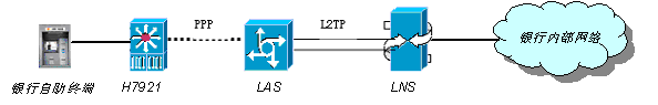 在上圖4中,銀行ATM自助終端通過目前的GPRS&CDMA無線網絡接入終端,實現網絡連接,移動/聯通等運營商提供了接入服務器LAC,通過無線終端設備向運營商接入服務器LAC發起PPP撥號,實現與銀行中心接入服務器LNS之間的L2TP隧道的建立,并將無線終端的PPP撥號轉向銀行接入服務器LNS,最終實現無線終端與LNS之間的PPP會話的建立,在銀行網絡核心,部署一臺安全VPN服務器,接受來自無線網絡接入終端的IPSec會話請求,通過與ATM自助終端無線VPN終端之間建議IPSec隧道,實現相互之間數據傳輸的安全加密。