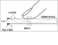 多點觸控技術(shù)的核心是FTIR(Frustrated Total Internal Reflection),即受抑內(nèi)全反射技術(shù)。如圖2所示,由LED(發(fā)光二極管)發(fā)出的光束從觸摸屏截面照向屏幕的表面后,將產(chǎn)生反射。如果屏幕表層是空氣,當入射光的角度滿足一定條件時,光就會在屏幕表面完全反射。但是如果有個折射率比較高的物質(zhì)(例如手指)壓住丙烯酸材料面板,屏幕表面全反射的條件就會被打破,部分光束透過表面,投射到手指表面。凹凸不平的手指表面導(dǎo)致光束產(chǎn)生散射(漫反射),散射光透過觸摸屏后到達光電傳感器,光電傳感器將光信號轉(zhuǎn)變?yōu)殡娦盘枺到y(tǒng)由此獲得相應(yīng)的觸摸信息。